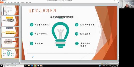 会议伊始,主持人贾云老师对即将开展岗位实习的同学们进行了安全教育,重点说明了岗位实习的基本内容、形式以及实习结束后实习报告的要求、实习考核办法等。接着,对需要提交的各项材料进行了仔细的说明,强调了实习相关注意事项。