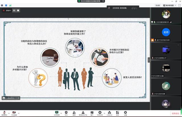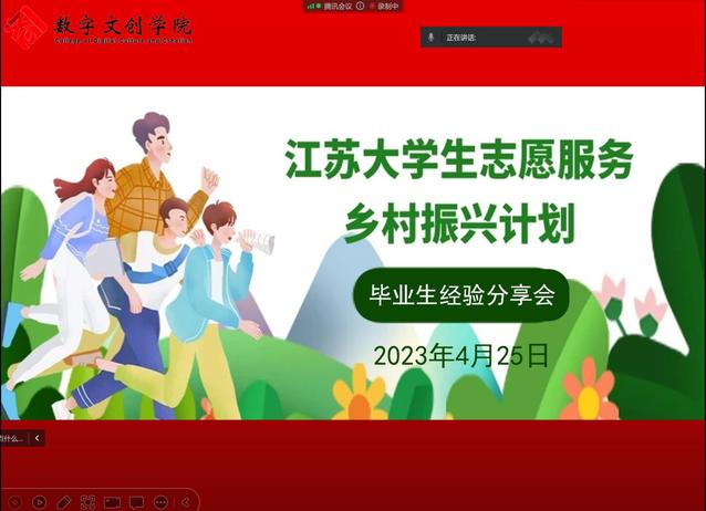 为帮助学生合理规划大学生活,树立正确的就业观念,做好大学职业生涯规划,4月25日晚,数字文创学院通过腾讯会议方式为我院20级和21级学生举办了一场线上“江苏大学生志愿服务乡村振兴计划”毕业生经验分享会。