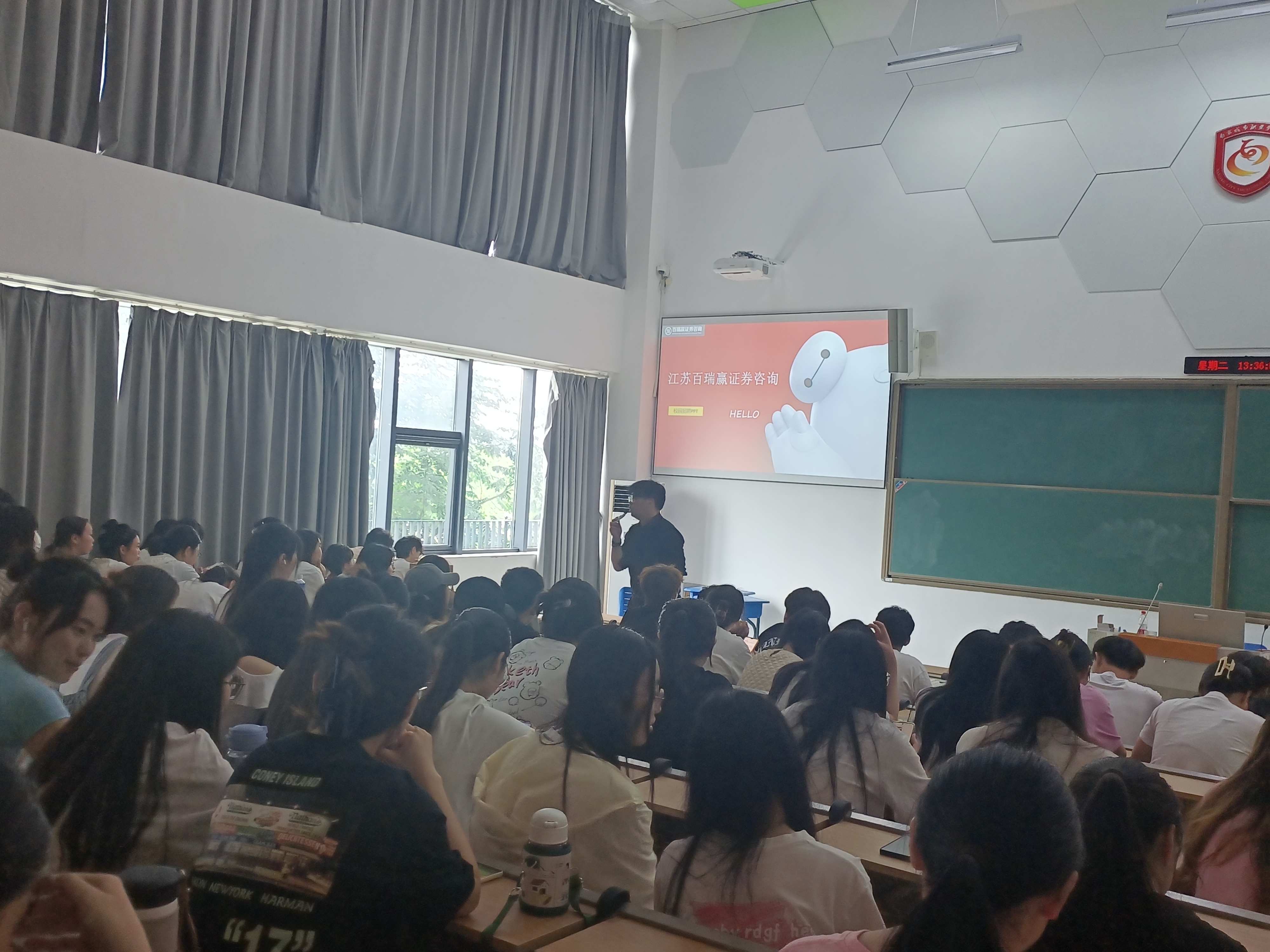 6月13日中午1点20分,江苏百瑞赢证券咨询公司一行三人前来我校,在数字财商学院厚生楼309阶梯教室进行岗位实习宣讲会。