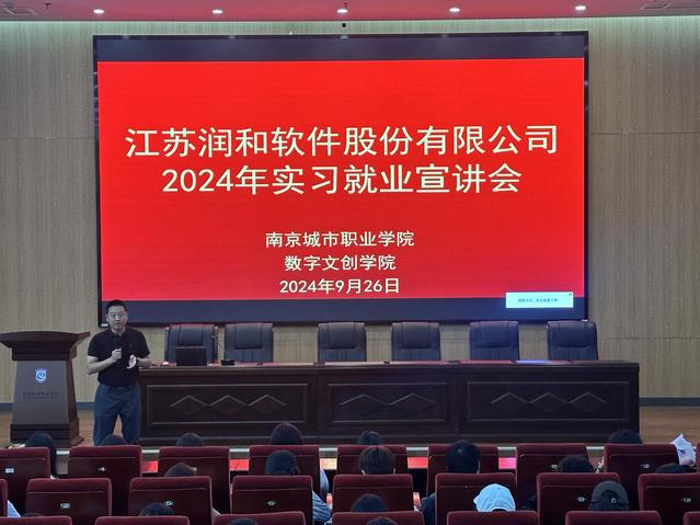 9月26日中午12:30,数字文创学院在我校办公楼一楼报告厅举办江苏润和软件股份有限公司2024年秋季校园招聘会。本次招聘会由学院党总支副书记、副院长陈乃鸿主持,全院近200名同学参加。