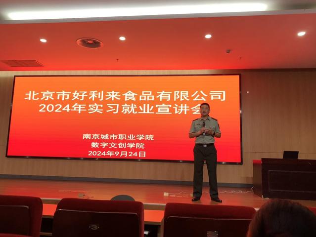 为积极响应党中央、国务院“稳就业、促就业、保就业”的号召,9月24日中午12:30,数字文创学院在图书馆一楼报告厅举办2024年秋季北京市好利来食品有限公司校园招聘会。本次招聘会由学院党总支副书记、副院长陈乃鸿主持发言,全院近200名同学参加。