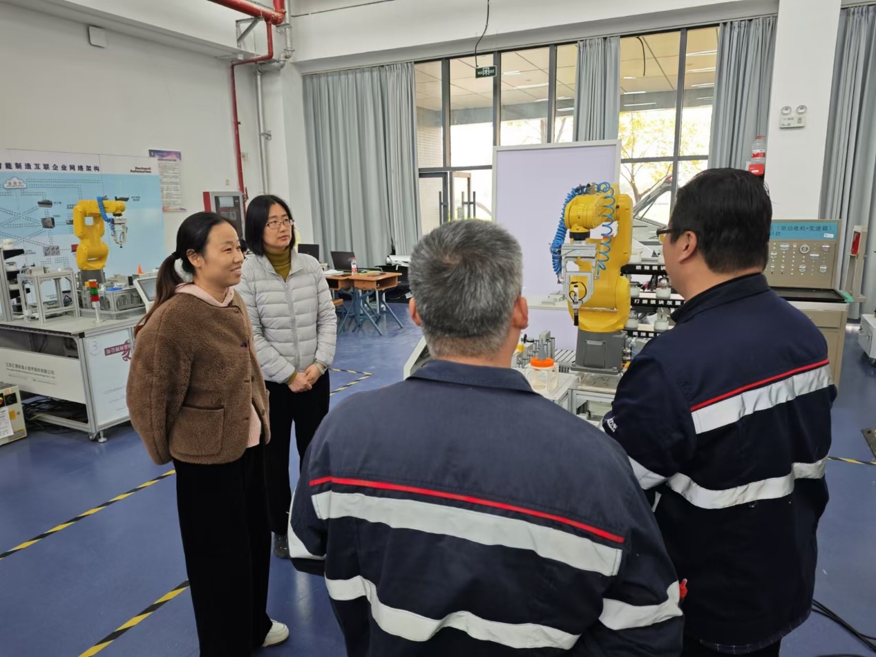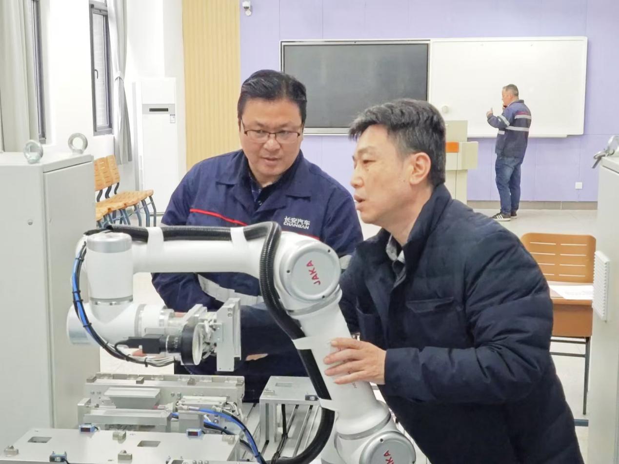 在实训工厂,殷军饶有兴趣地观察了工业机器人的运行情况,并惊喜地发现其与南京长安实际使用的品牌和型号完全一致。他表示,这一高度契合为双方在企业员工培训方面提供了得天独厚的条件,不仅可以实现企业员工到校接受专业培训,还能共同合作开发培训教材,以及在技术研发领域开展深度合作。这种合作模式将有助于提升企业员工的技能水平,同时也能让学院的教学内容更加贴合实际产业需求。