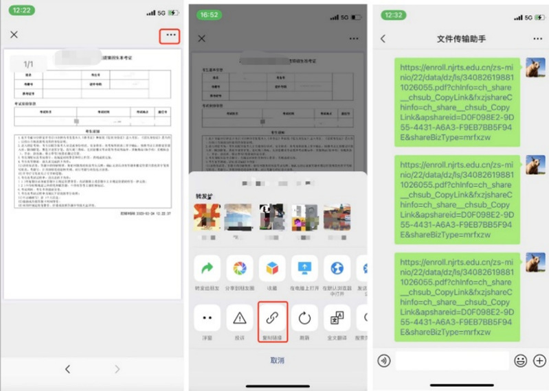 苹果手机:点击右上角的...按钮后,在浮窗内点击复制链接,在微信内粘贴链接。点击访问该链接后,随时可以查看自己的准考证信息,打开链接进行打印。