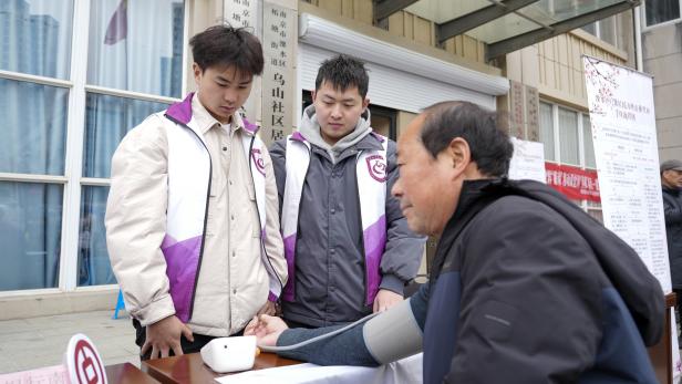 在血压检测和健康养生咨询区域,志愿者们为社区居民提供免费的血压检测服务,并根据检测结果给予健康指导和建议。爷爷,高压有点高哦!您平时要注意饮食,清淡一点。”智慧健康养老服务与管理专业的学生朱令基对前来测压的老人说。